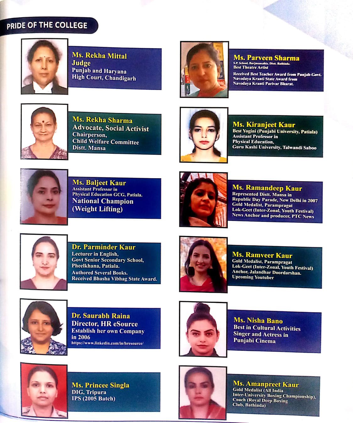 Some of our distinguished alumni are, Late. Mrs. Rekha Mittal, Advocate, Social Activist, Mrs. Baljeet Kaur, Assistant Professor in Physical Education GCC, Patiala, National Champion (Weight Lifting), Dr. ParminderKaur, Lecturer in English, Govt. Senior Secondary School, Pheerkhana, Patiala, Author, Dr. SaurabhRaina, Director, HR eSource, Establish her Own Company, Ms. PrinceeSingla, DIG, Tripura, IPS (2005), Ms. Parveen Sharma, Best Theatre Artist, Best Teacher Award From Punjab Govt., Ms. KiranjeetKaur, Best Yogini (Punjabi University, Patiala), Assistant Professor in Physical Education, Ms. RamandeepKaur, News Anchor and Producer, PTC News, Ms. RamveerKaur, Anchor, Jalandhar Doordarshan, Ms. NishaBano, Singer and Actress in Punjabi Cinema, Ms. AmanpreetKaur, Gold Medalist (All India Inter-University Boxing Championship), Coach (Royal Deep Boxing Club), Bathinda.